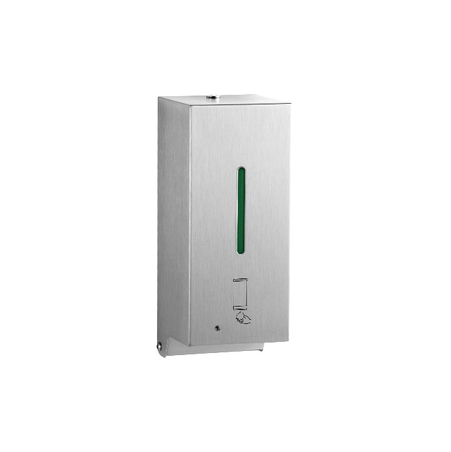 El dispensador automático de jabón de pared será de acero inoxidable tipo 304 con acabado satinado. La válvula resistente a la corrosión dispensará una variedad de jabones en espuma, jabones en espuma a base de yodo y desinfectantes de manos en espuma a base de alcohol. Tenga en cuenta que la calidad de la espuma puede variar cuando se usa con desinfectante de manos en espuma. La válvula se activará mediante sensor y no requerirá contacto con el dispensador para funcionar. La carcasa con cerradura estará equipada con una ventana indicadora de recarga de acrílico transparente y tendrá bisagras para facilitar la recarga y el mantenimiento. El recipiente tendrá una capacidad de 800 ml (27 onzas líquidas). La unidad tendrá la certificación CE