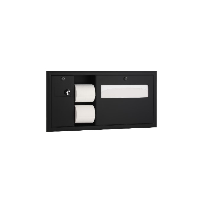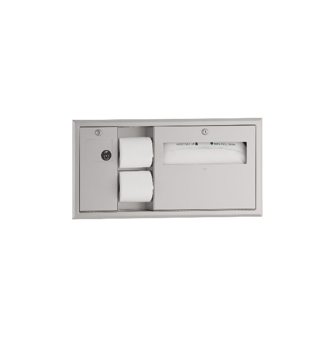 Acero inoxidable con acabado satinado. Se instala a ras de la pared lateral del compartimento accesible del inodoro para dejar espacio para la barra de apoyo superior. La unidad cuenta con un dispensador de papel higiénico a la izquierda. El dispensador de fundas para asientos de inodoro tiene capacidad para 500 fundas de papel. Triturador de residuos extraíble para su mantenimiento. Capacidad: 1,9 L (0,5 galones). Abertura aproximada de la pared: 675 x 320 x 102 mm (26-5/8″ de ancho x 12-5/8″ de alto x 4″). Patente en trámite.