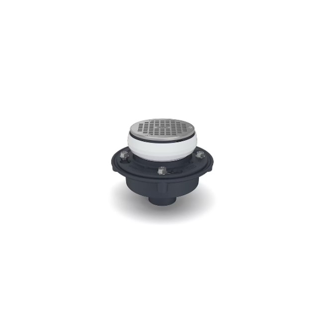 El drenaje de piso y ducha Zurn EZ1 con cuerpo de hierro fundido está diseñado para simplificar la instalación del producto, el ajuste posterior al vertido y los calzos preempaquetados para la corrección de inclinación.